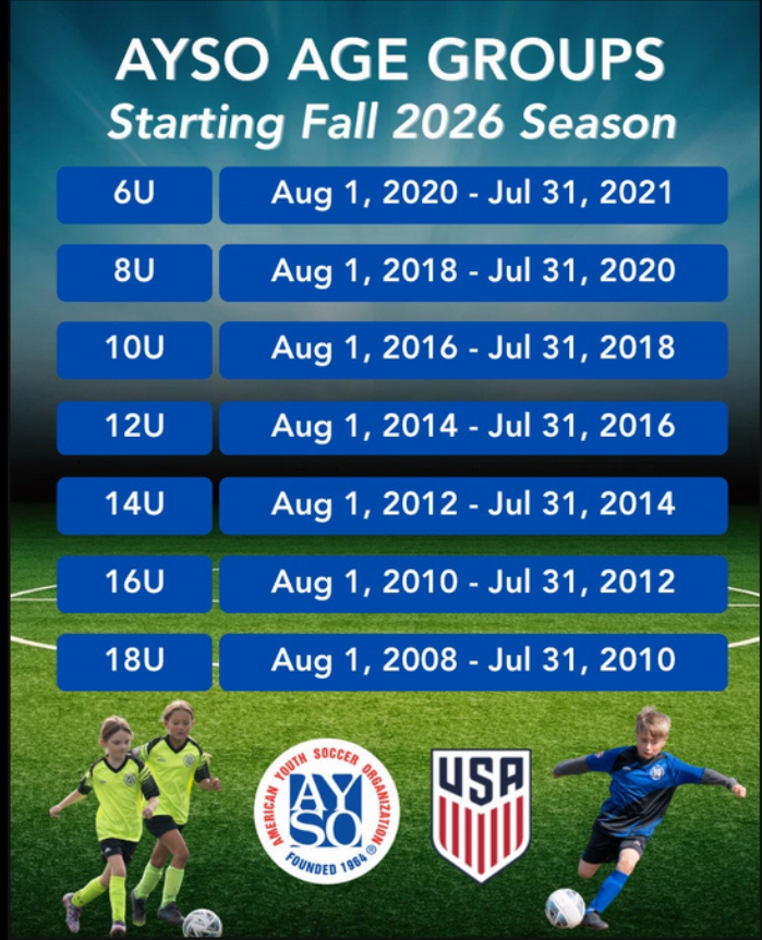 Per AYSO National governing documents, AYSO will be changing from a school year registration to a birth year registration in order to align with other youth soccer providers’ interpretation of the U.S. Soccer Player Development Initiatives.
